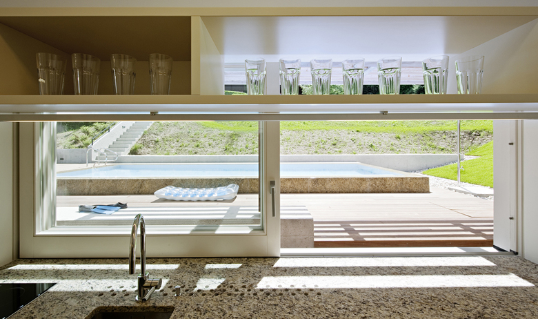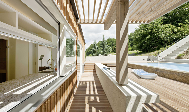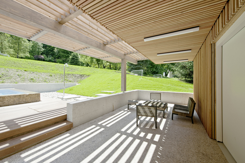 Ein großes Grundstück mit einem Wohnhaus am Waldrand und familiäre Veränderungen mit zusätzlichen Bedürfnissen waren die Ausgangsbasis für die Entwicklung eines ergänzenden Nutzungsbereiches, der alle räumlichen Wünsche erfüllen und die Qualitäten des Grundstückes nützen soll. Als Entwurfslösung sind verschiedene Ebenen und ein Badehaus an die sonnigste Stelle des Grundstückes geschoben. Eine beheizte Stiegenanlage verbindet sie über das stark ansteigende Gelände mit dem Wohnhaus. Die technische Anbindung wird mit einer Hebeanlage bewerkstelligt. Das Überlaufbecken zum Schwimmen bildet mit seinem ständig umspülten Natursteinsockel eine glänzende Wasserebene. Die angrenzende Sonnenterrasse fängt die späte Abendsonne ein. Die halbbeschattete Ebene zur Bewegung und Kommunikation ist vom eigentlichen Gebäudeniveau durch eine lange Bank aus Beton getrennt. Diese Konstruktion funktioniert von der Hausseite als Ablage und Stehpult. Der Essbereich schiebt sich in den Schatten des Gebäudedaches. Im Haus selbst sind neben einem Aufenthaltsbereich alle notwendigen Nebenräume kompakt untergebracht. Die Kochzeile wandelt sich im Sommer zur Ausschank. Wo im Winter die Terrassenmöbel verstaut werden, öffnet sich bei Bedarf ein großzügiger Raum mit Anrichte. Als Materialien kommen Holz, Naturstein und sandgestrahlter Beton zum Einsatz. Diese Oberflächen verbinden sich durch ihre natürliche Alterung mit dem Garten. Es entstand ein Bereich unterschiedlichster Nutzungen abseits des Wohngebäudes. Die einzelnen Familienmitglieder und Gäste genießen die vielen neuen Möglichkeiten: Der Hausherr probt ungestört mit seiner Musikgruppe. Freunde werden zum Besuch der Sauna eingeladen. Gästen wird eine Unterkunft angeboten. Alle entspannen sich beim Schwimmen und Sonnen. Es wird gekocht, gegessen und gefeiert!