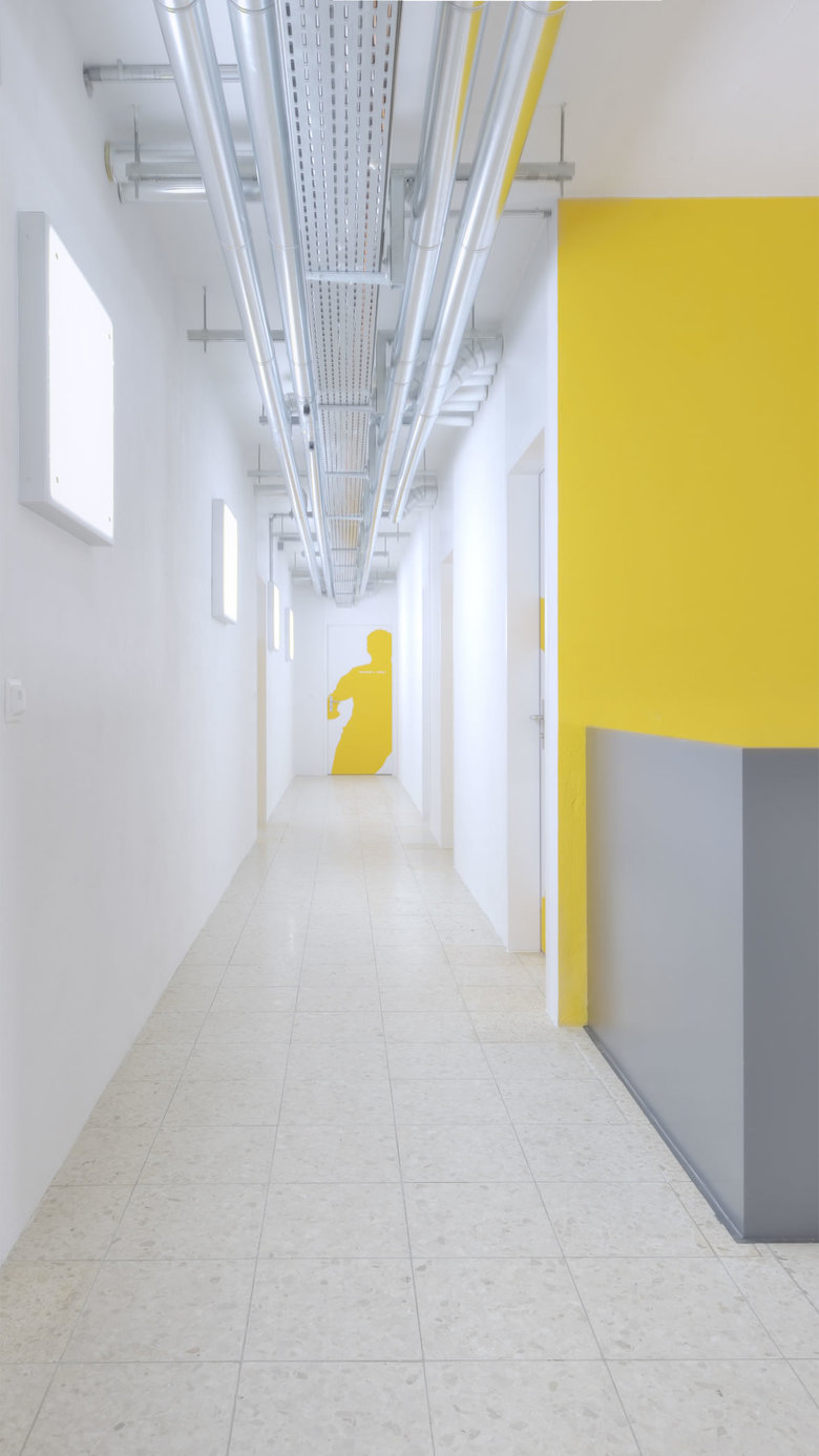 Bereits an der markanten Aussenwand beim Zugang zur Turnhalle wird der Besucher mit aufgemalten, übergrossen Sportlersilhouetten abgeholt. Diese vermitteln vom Aussen- in den Innenraum, wo die Besucher und Nutzer der Turnhalle von weiteren Sportlerfiguren empfangen werden. Im Innern wird mit oranger Farbe die Verbindung vom Besucherbereich zur Turnhalle hergestellt. Die Farbe leitet den Besucher und Nutzer durch die Turnhallenanlage.