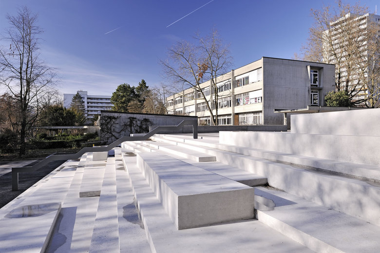 Der Vorplatz der Volksschule wurde bis anhin nur wenig genutzt. Um den Vorplatz zu aktivieren, wurde ein neues, den Höhenversprung überwindendes Zwischenelement geschaffen. Dieses lädt zum Sitzen, Spielen und Klettern ein und ersetzt die vorhandene Treppe. Die bestehenden Bäume wurden gefällt und durch zwei neue einheimische Bäume ersetzt. So entstand ein grosszügiger Sichtbezug zum Pausenplatz. Auch die Form dieses neuen Elements vermittelt zwischen den beiden Plätzen. Das «Grundmodul» ist ein verzerrtes Rechteck, welches sich aus der Situation herleitet. Die begehbare Skulptur besteht aus einer Stapelung und Aneinanderreihung verschiedener Skalierungsformen des Ausgangselements. Die Treppenanlage besteht aus vor Ort gegossenem, hell eingefärbtem und geschliffenem Beton.