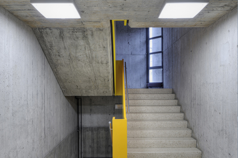 Die helle Holzverkleidung in der Turnhalle lässt den Raum grösser erscheinen, die orangefarbigen Zargen zum Zuschauerbereich bilden einen attraktiven Kontrast zum hellblauen Hallenboden. Frische und helle Farben kompensieren das Manko der fehlenden natürlichen Belichtung und erzeugen eine für die Nutzer und Besucher angenehme Umgebung.