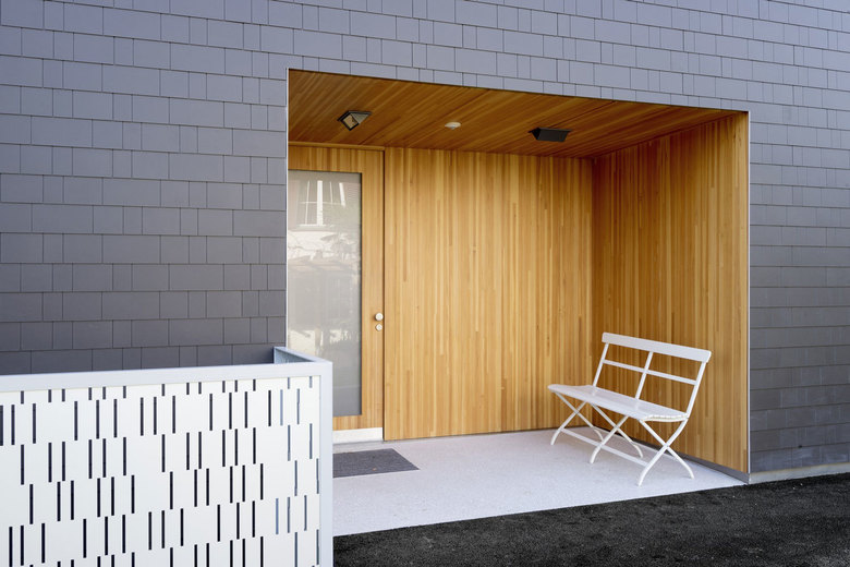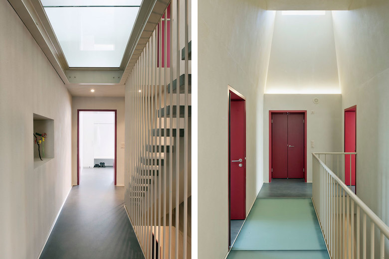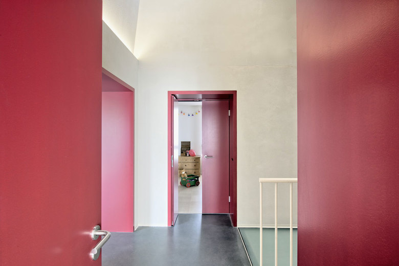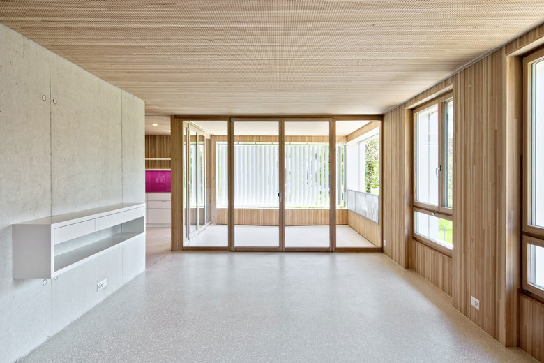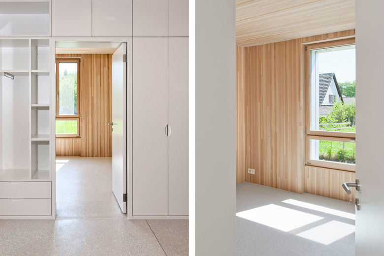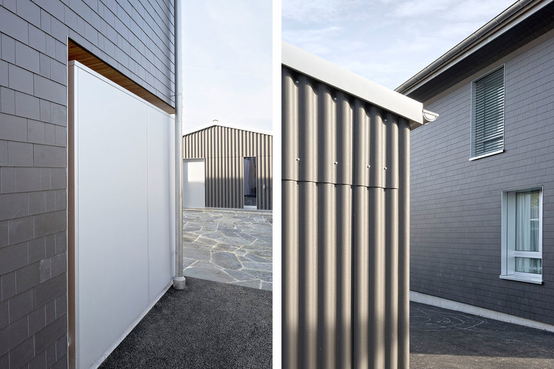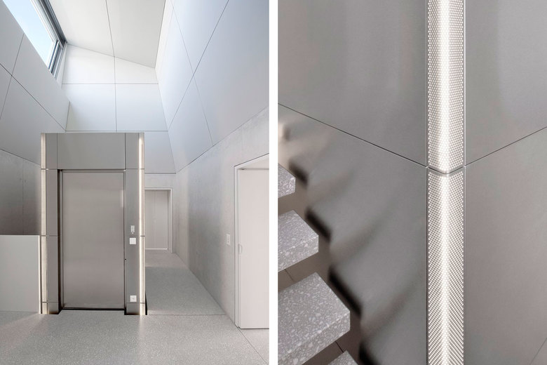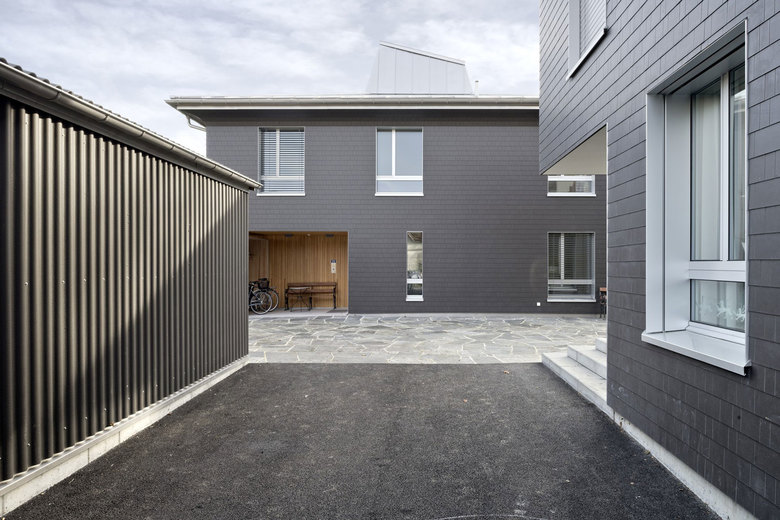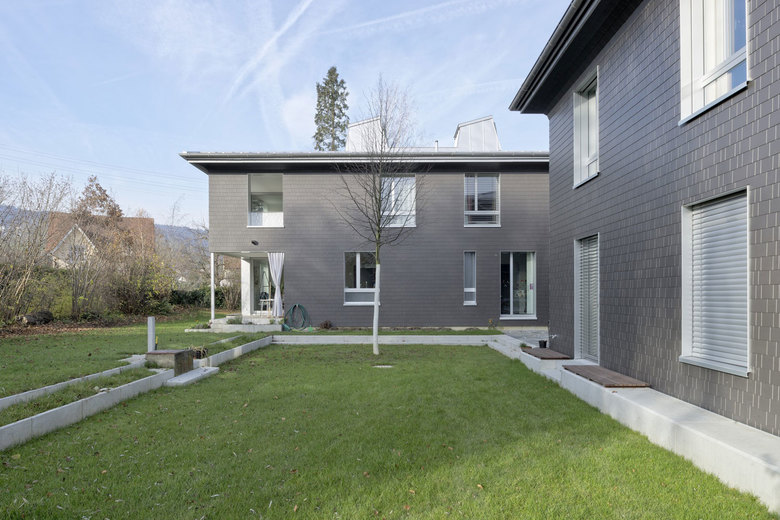 Das Ensemble aus zwei Einfamilienhäusern und ihrem zugehörigen freistehenden Nebenbau wird in seiner Körnung und Materialität geprägt durch den Gebäudetypus einer Stadtvilla der 1930er Jahre, welcher das Quartier beschreibt. Dabei spiegelt die mit silbergrauen Eternitschindeln besetzte Aussenhülle, das Bild einer Klinkerfassade in Massstäblichkeit und Langlebigkeit wider. Mit Blech überzogene Steildächer werden durch Laternen überkrönt, die den Innenraum tagsüber mit natürlichem Licht versorgen und im Sommer nachts der Kühlung dienen.