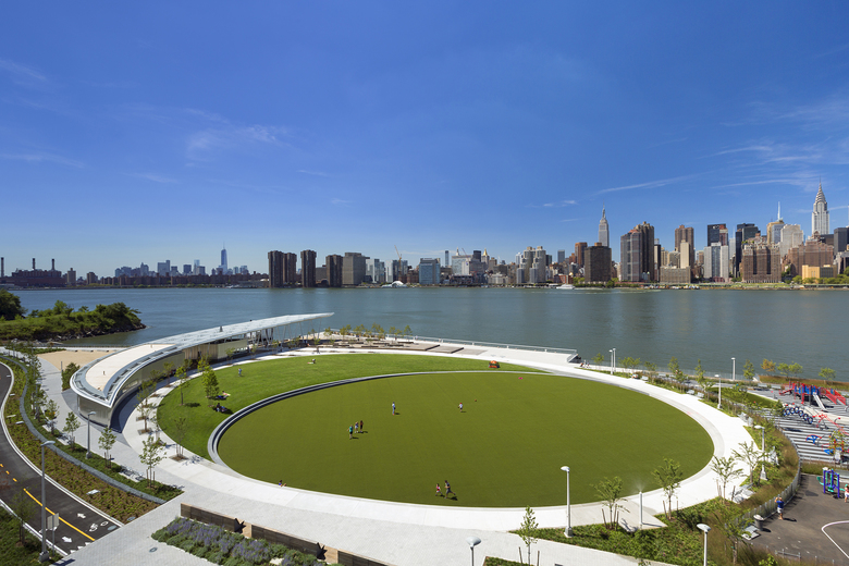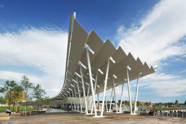 A new multi-use green oval defines the most generously open part of the site and offers views directly across the river to Manhattan. This green anchors the park’s north precinct and is framed by a continuous path and pleated steel shade canopy on the south side which follows the curve of the oval and offers shelter for a water ferry stop and concession building. The rooftop photovoltaic panels provide enough power to support the pavilion and park lighting.