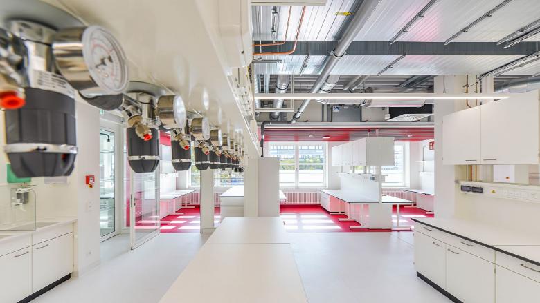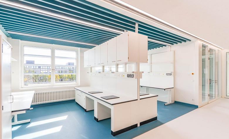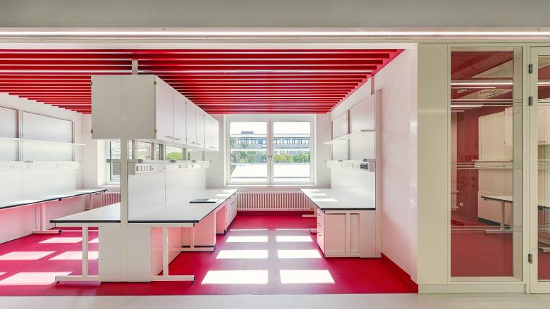Die durch die Fensterrahmen bildartig in den Innenraum wirkende, bewegte Außenwelt schafft die inspirierende Umgebung für den wissenschaftlichen Austausch. Gleichzeitig öffnet sich der Innenraum nach außen in den Stadtraum und ermutigt das interessierte Publikum zum Betreten und Erleben des Forschungszentrums. Der Eingangshalle mit den Konferenzräumen lebt von einer reduziert-eleganten Atmosphäre, geprägt durch hellen Terrazzo, schwarze Wand- und Bodenbeläge und hochwertige Holz- und Glaselemente. Ein Kontrastprogramm erleben die Forscher:innen in den beiden hochmodernen Laboretagen, in denen sich jeweils eine auffällige, frische Farbigkeit in Blau oder Pink von Decken- und Bodenbelägen, über das Mobiliar bis hin zu den Sanitärbereichen zieht.