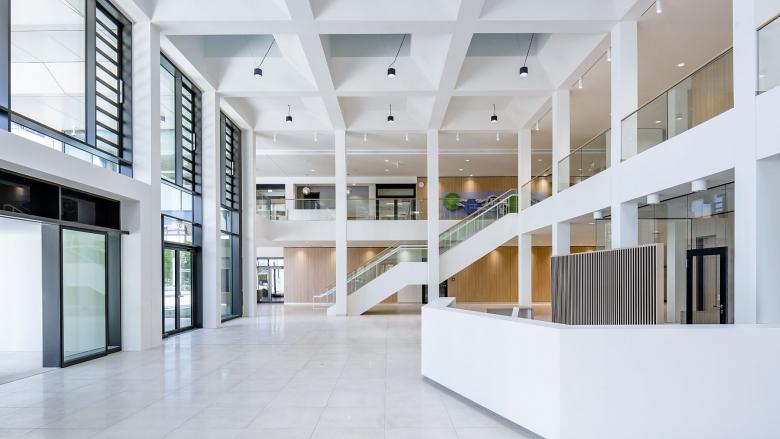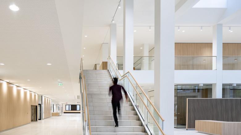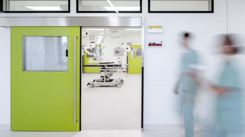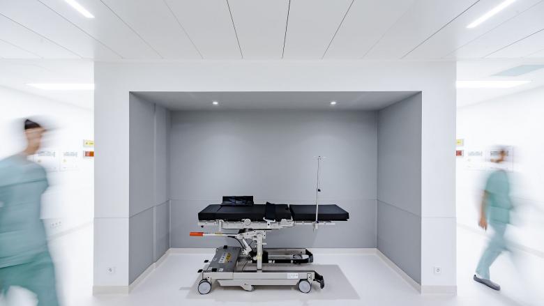 Essentiell für einen angenehmen Aufenthalt ist neben viel Tageslicht und einer von hochwertigen Materialien wie Holz und Naturstein geprägten Atmosphäre eine gute Orientierung. Das wichtigste Element ist hierbei die ein- bis zweigeschossige Magistrale. Sie startet in der Eingangshalle und führt zu den jeweiligen Ambulanzbereichen und Abteilungen. Später wird sie auch den zweiten Bauabschnitt an die Eingangshalle und das gesamte Haus anbinden.