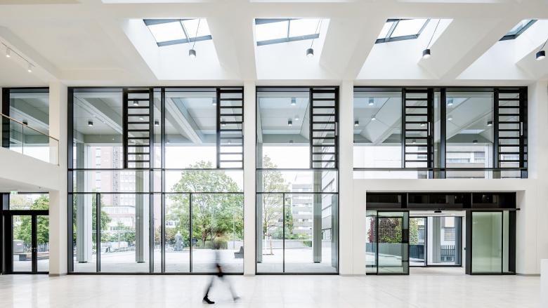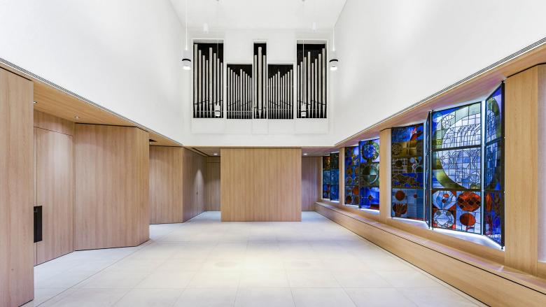 Ein besonderer Raum ist der für alle Menschen offene Raum der Stille – geprägt von den einzigartigen, bereits für den alten Klinikbau geschaffenen Glasfenstern des Karlsruher Künstlers Emil Wachter.