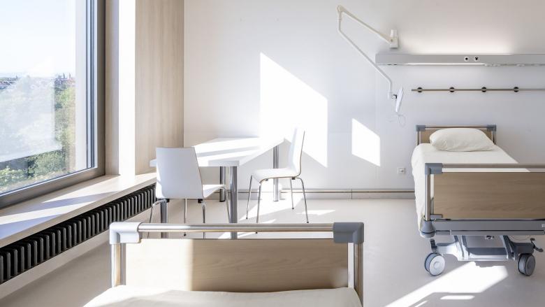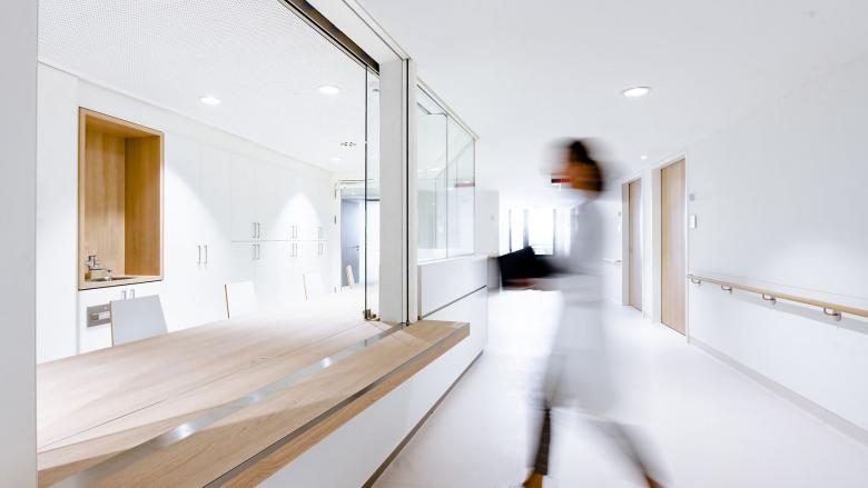 Die Stationen sind ringförmig um einen Innenhof organisiert, sämtliche Zimmer orientieren sich nach außen und bieten wunderbare Ausblicke in die Landschaft, gerahmt von einem großen Holzelement. Empfang, Stützpunkt und Personalaufenthaltsräume bilden das großzügige Stationszentrum nahe des jeweiligen Stationseingangs. Tagesbelichtete Flure führen zu zusätzlichen kleinen Loungebereichen – besondere Angebote neben den komfortabel ausgestatteten, großzügigen Patientenaufenthaltsräumen.