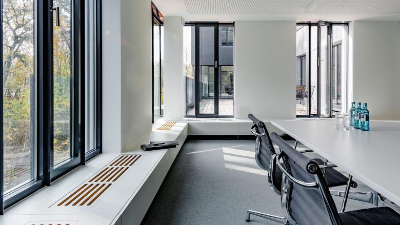 Der Kern des Neubauteils wird über die Weiterführung des bestehenden Magistrale im Erdgeschoss erschlossen. Auf dem Weg dorthin werden Konferenzraum und Cafeteria ohne Kreuzung der Bürozonen passiert. Die Büroflächen sind konstruktiv stützenfrei. Damit sind beliebige Aufteilungen vom Zellenbüro bis zum Großraumbüro möglich.