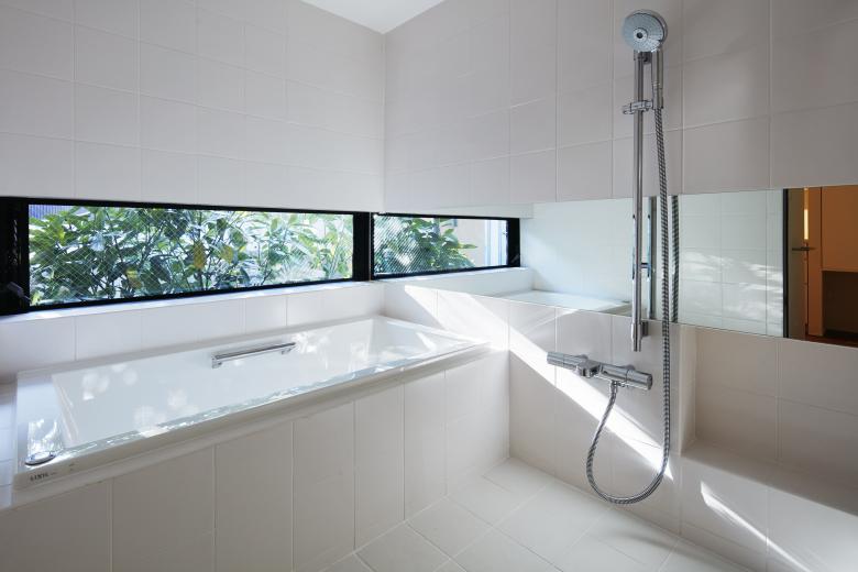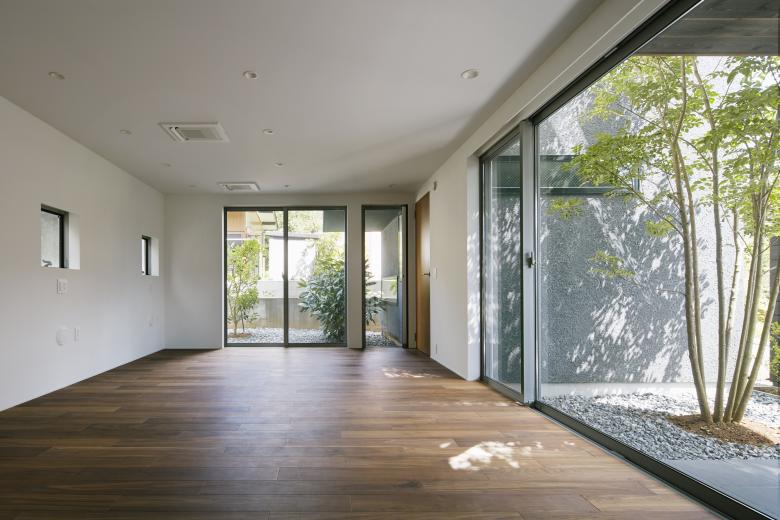 The house is for a family of four, a couple and two children. The site is located in a quiet residential area on a gentle southern slope, with abundant greenery along the road. Because of the narrow frontage and deep shape of the original plot, three equivalent gardens were arranged instead of one large garden to eliminate the environmental gap between the southern part on the road side and the northern part at the back of the site. These are the front garden on the approach to the street side, the courtyard in the center of the building, and the back garden on the north side. The main living room, dining room, and bedrooms are designed to have views of two of the three gardens, and the house is designed to allow the residents to feel close to various external spaces in various scenes of their lives. The house is spread over three floors from the basement to the second floor, but two devices were created to create a sense of unity without dividing the space between floors. The first is a vertical flow line that combines stairs and a ramp, allowing the eye to move in various directions as the viewer's perspective shifts. The other is a courtyard with a balcony. By covering half of the courtyard with a balcony, a roofed terrace is created on the first floor and an open terrace space is created on the second floor, connecting the first and second floors by allowing the eye to pass through this semi-exterior space in a diagonal direction.