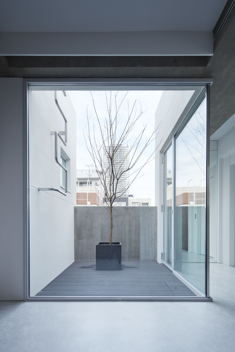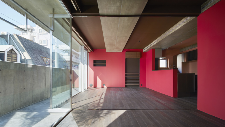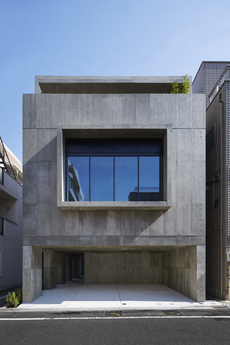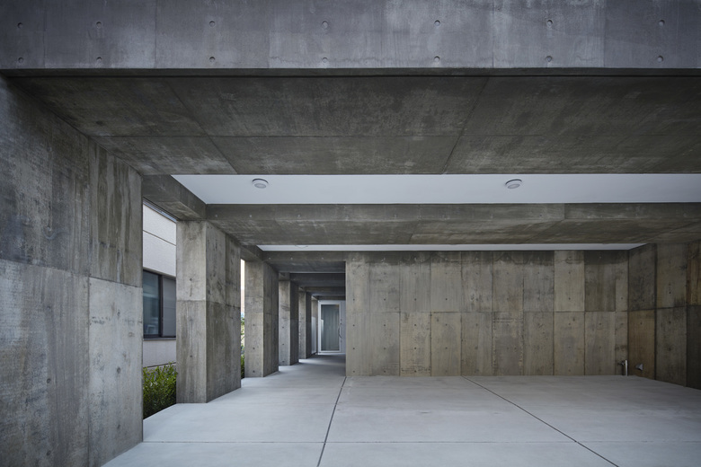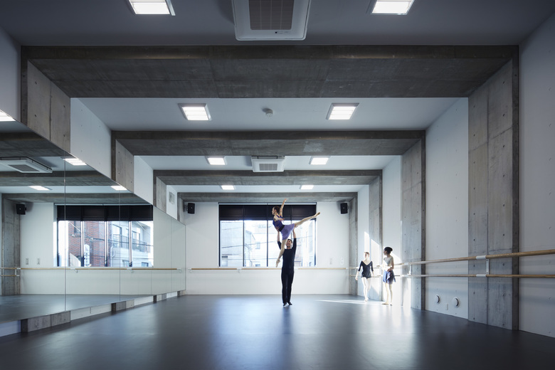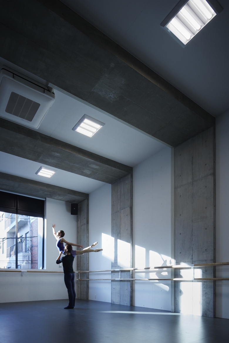A three-story mixed-use building for a ballet dancer couple, consisting of a residence and a studio for ballet classes. The ballet studio is located on the second floor where the maximum volume can be secured, the first floor is used for rooms related to the ballet studio, and the third floor is used for the living area of the two-family house. In order to maximize the effective area of the ballet studio space and to secure a ceiling height of 4 m, columns and beams were made flat and thin, and a 2.4 m span gantry frame was laid out. The simple request to enlarge the ballet studio space was pursued in a straightforward manner, resulting in a simple space with a plain but fundamental strength.