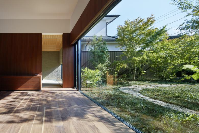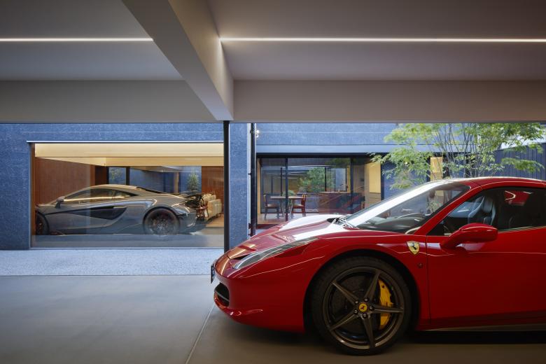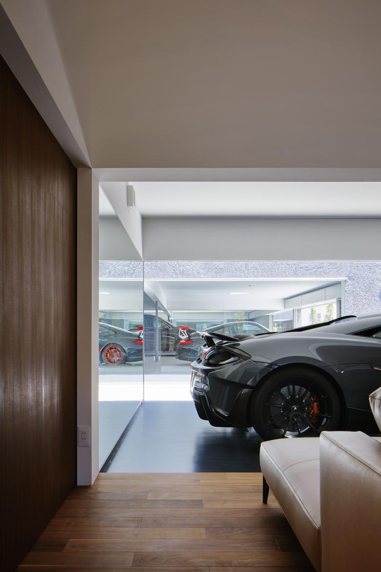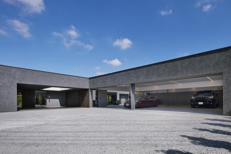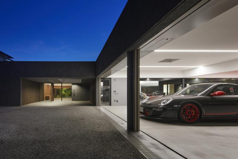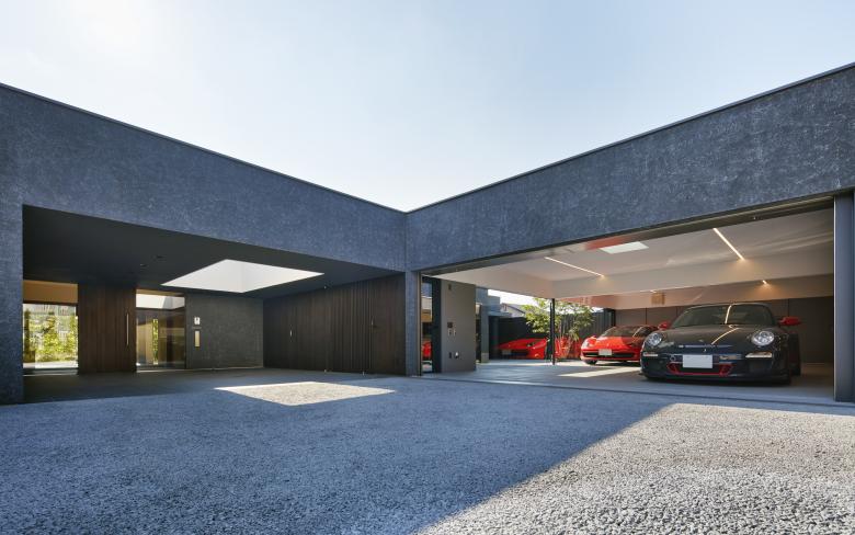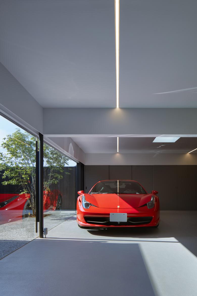 Eight cars, five motorcycles, four bicycles, and a flat roof. I want to be able to see the cars from the living room," he said. The new house was planned on a flat site of 280 sq.m., which included a parking lot and a field that spread out to the north of the architect's current house. Looking at the cars he owns, all of them are beautiful and have in common a wide width and a low height. I intuitively wanted to incorporate these beautiful horizontal proportions into the architectural space. For the planning, we studied how the approach to the car and the parking space for 8 cars should be arranged, and adopted the most rational plan. Taking into consideration the size of the cars and their turning tracks, the basic unit of planar dimension is 6,000. A 12-meter square per side for cars and a 21-meter square per side for people were arranged on the site. The residential portion of the building is a 21m square plane, closed off from the surrounding area, but with four inner courtyards of different sizes and atmospheres, creating a comfortable and tranquil living environment. The space is divided into sections by a hanging wall that rises 1,900 above the floor. This low hanging wall divides the space, which extends forever in the horizontal direction, creating a sense of serenity as a residence. The final image of the house is a garage-garden house where people, cars, and greenery can live in harmony.