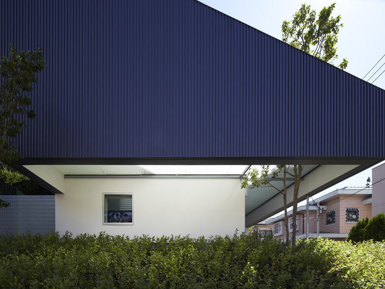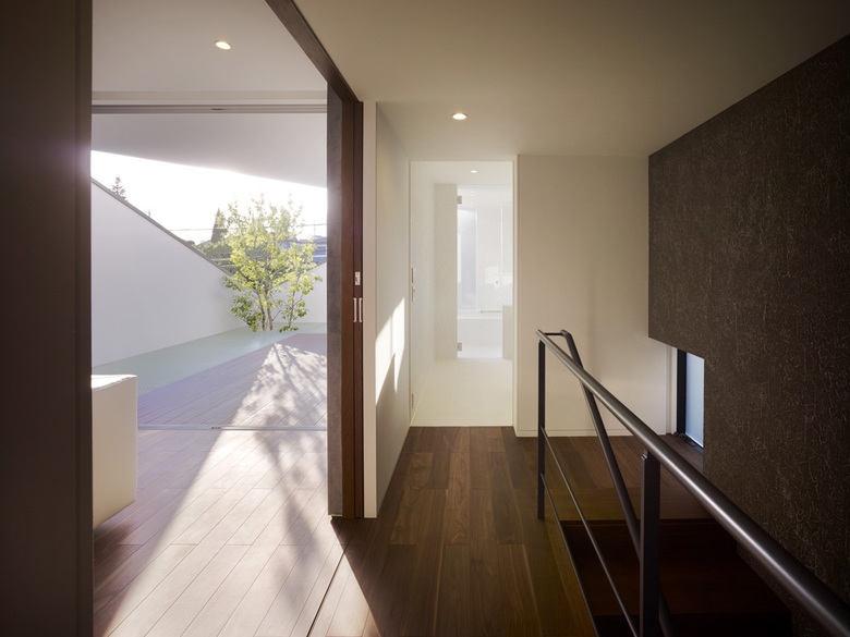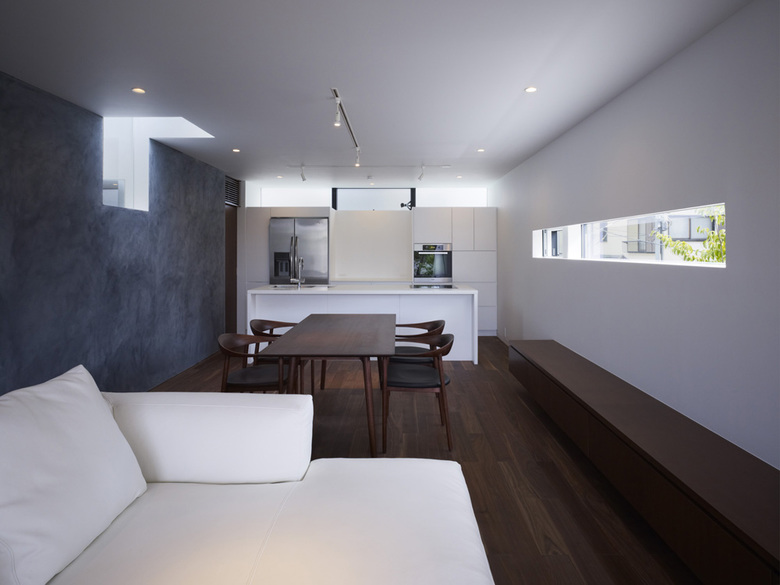 A semi-subterranean recess, created by excavating the site 1.5m above the street level, was used as a space for a bedroom and study, creating a moderately enclosed and relaxed atmosphere. A simple rectangular box was placed on top of it to serve as the living room and water area. Furthermore, by cutting off the corners of this rectangular box, a large triangular opening to the sky was created. The living room, terrace, and bathroom are arranged around the opening, and we expected various activities to develop while maintaining an appropriate relationship with the surrounding environment.
