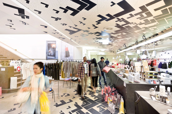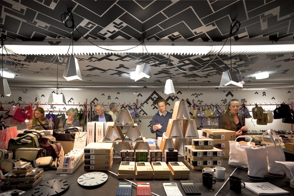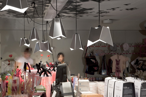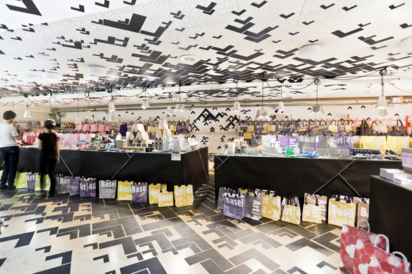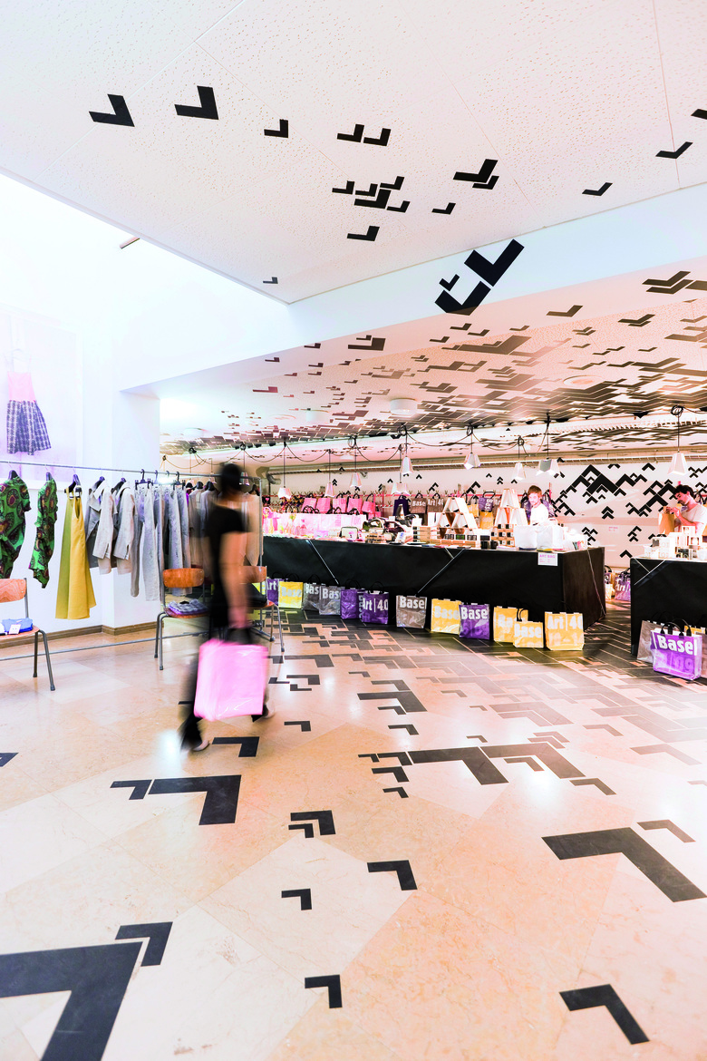 Hunderte von schwarzen Pfeile weisen dem Besucher den Weg die Treppe hinauf zum ArtShop. Die selbstklebenden Pfeile legen sich über Wand, Boden und Decke. Zum Zentrum hin verdichten sie sich und umspielen die reich gefüllte Auslage. Die Leuchten Batman&Robin schweben in dichter Anordnung über der Theke und rücken die bunten Produkte in den Fokus.